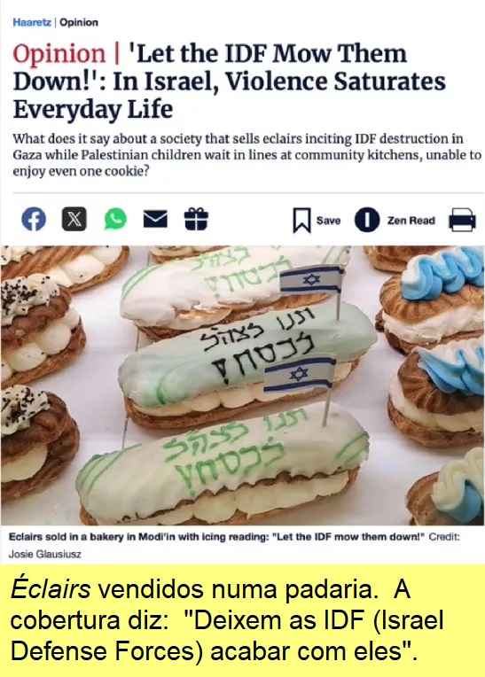 «Deixem o exército israelense destruí-los completamente» Em Israel, a violência satura a vida quotidiana. Foto: Bolos vendidos numa padaria israelense com a inscrição «Deixem o exército israelense destruí-los completamente»