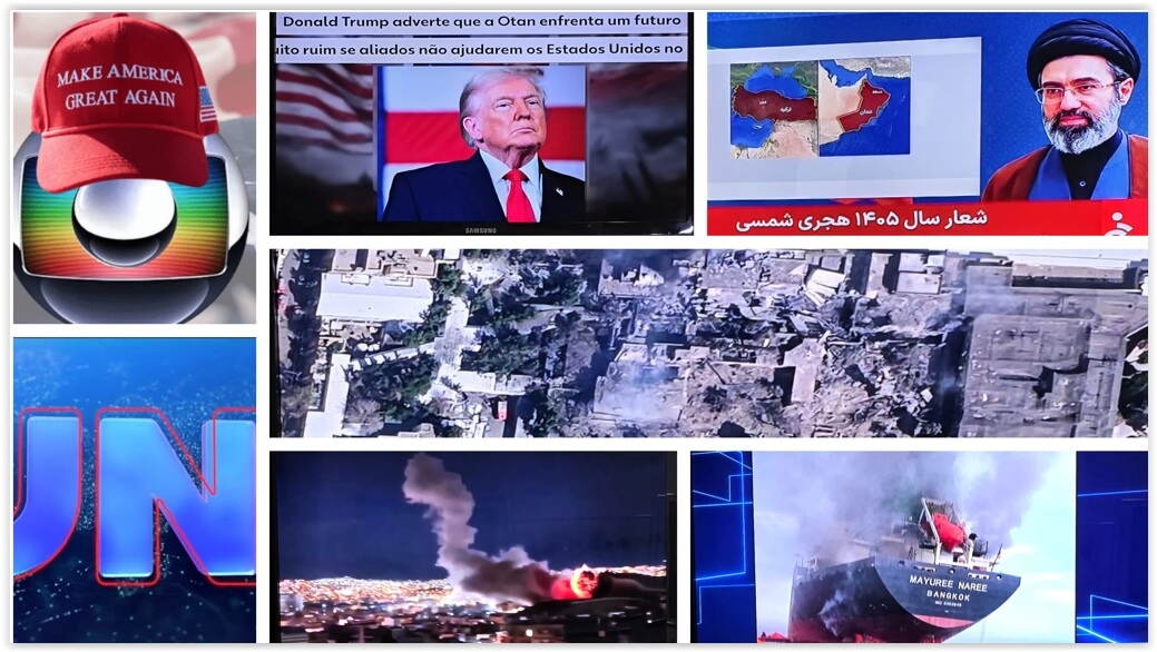 Para dar impressão de que Trump está vencendo a guerra, o JN faz de tudo. Ao invés de abrir sua edição de 16/3, com um Trump patético, pedindo apoio aos líderes de países europeus e do Japão para desobstruir o estreito de Ormuz, fechado parcialmente pelo Irã, jogou esta informação crucial para o meio da reportagem, passando por cima do que há de mais elementar em se tratando de técnica de edição.