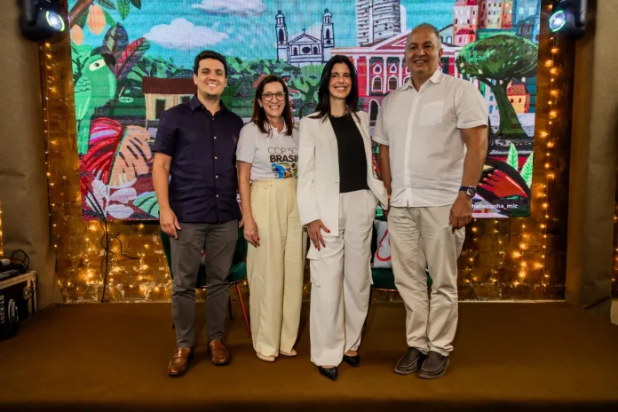 Lucas Vieira, Secretário Adjunto da Setur-PA, Claudia Valente, Assessora da Vice-Governadora do Comitê Estadual da COP-30, Fiamma Zarife, Diretora Geral do Airbnb na América do Sul e Eduardo Costa, Secretário da Setur-PA Crédito: Bruno Sarraf