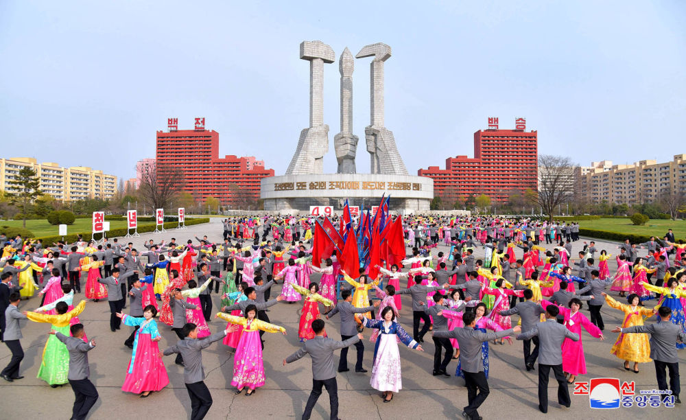 Jovens dançam na festa dedicada aos 25 anos da eleição de Kim Jong-il como presidente da Comissão Nacional de Defesa da Coreia do Norte, 9 de abril de 2018.