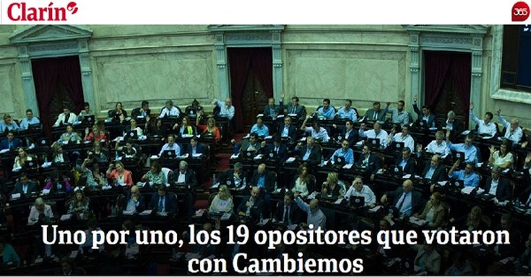 O jornal conservador Clarín “deita e rola” no deboche, dando manchete para os 19 deputados “de oposição” ,que acompanharam os 108 parlamentares do “Cambiemos”, partido do presidente Maurício Macri e ajudaram a fixar o placar favorável de 127 a 117 em favor da reforma da previdência argentina.