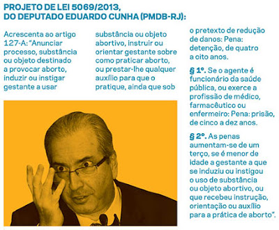 No horizonte próximo, outras ameaças em curso. É o caso do Projeto de Lei 5.069/2013, de autoria do parlamentar Eduardo Cunha (PMDB-RJ) e aprovado em outubro na Comissão de Constituição e Justiça da Câmara dos Deputados. O texto dificulta a realização deaborto em casos de estupro e prevê pena a qualquer um que oriente a vítima sobre as possibilidades legais de aborto em casos de violência sexual.