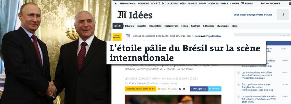 O maior jornal da França, Le Monde, disse em reportagem publicada nesta quinta-feira 22 que o Brasil sob o comando de Michel Temer se tornou uma “estrela pálida na cena internacional”.